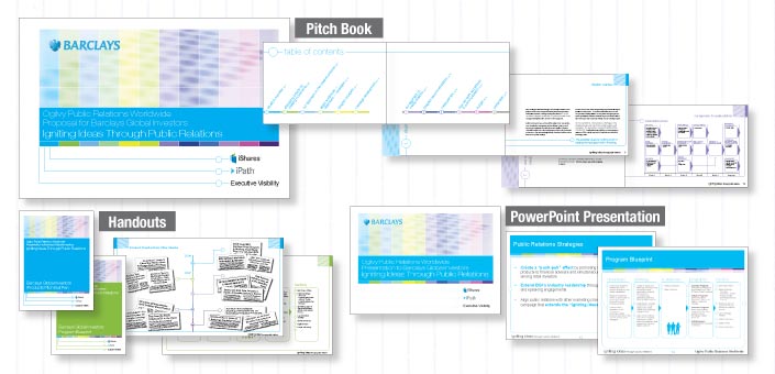 included coil-bound printed pitch book, leaflet-sized handouts, and a